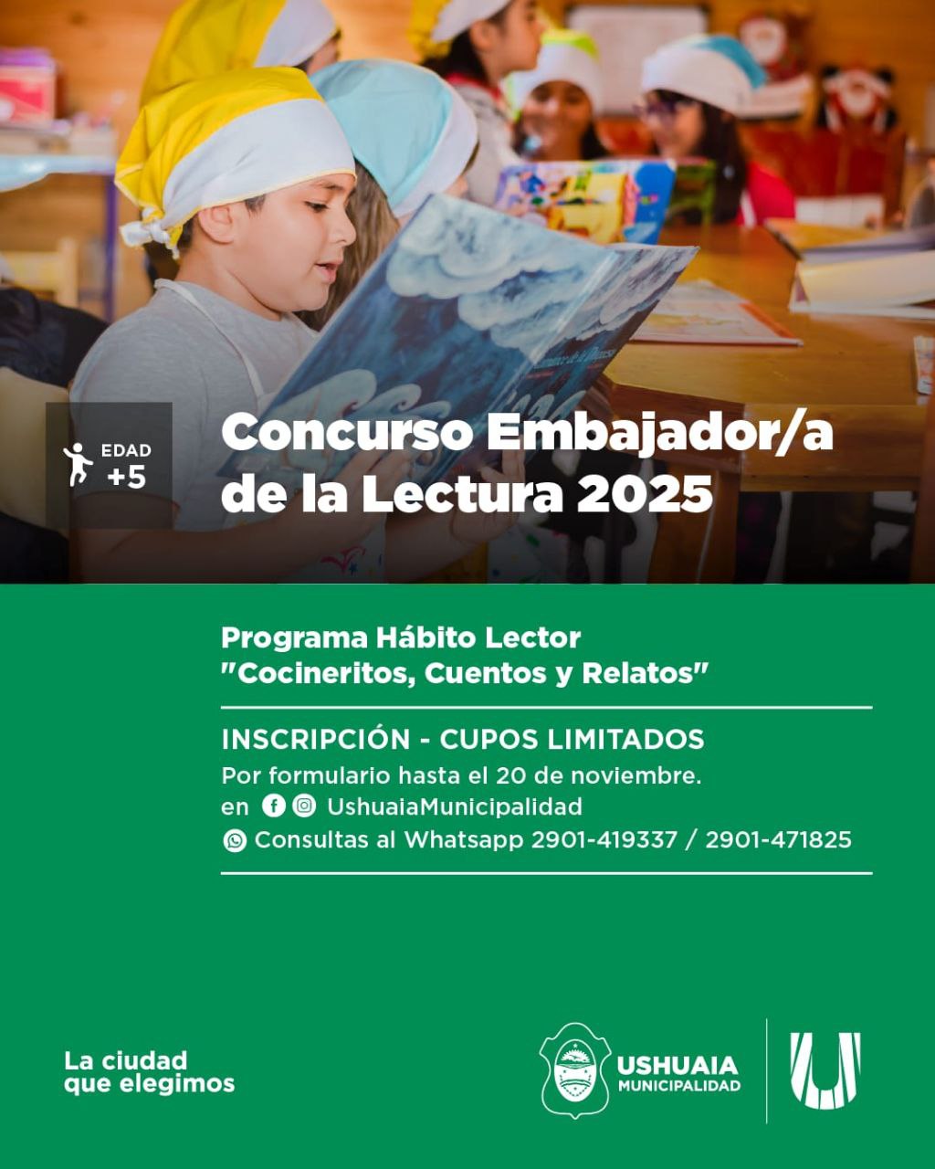 La Secretaría de Cultura y Educación de la Municipalidad de Ushuaia, a través del Programa “Hábito Lector: Cocineritos, Cuentos y Relatos”, informa a la comunidad que se encuentran abiertas las inscripciones al concurso “Embajador/a de la Lectura 2025”, certamen destinado a niños y niñas mayores de 5 años que busca promover el gusto por la lectura y la escritura creativa.