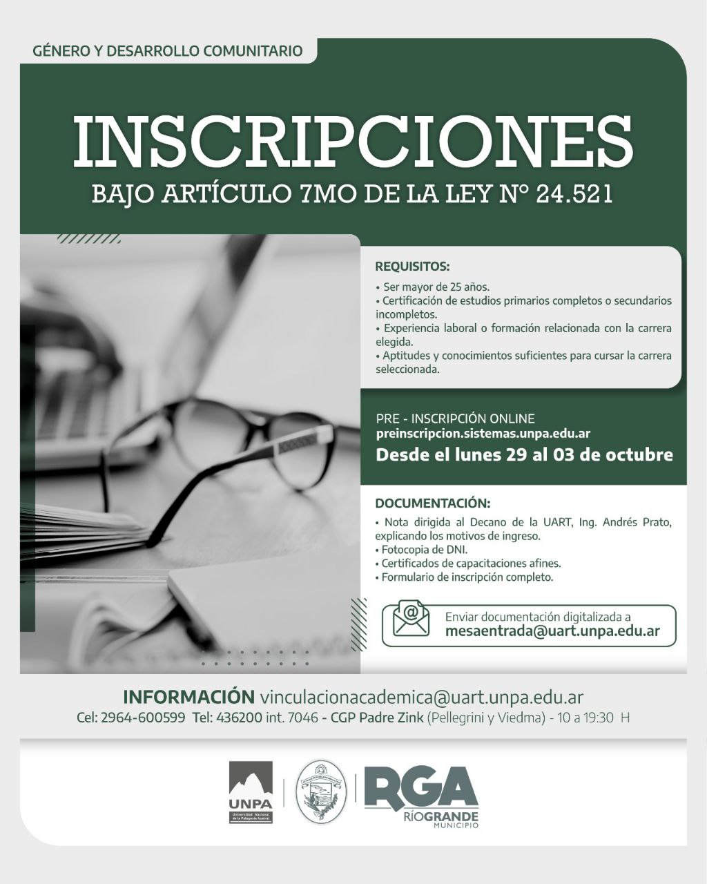 Para recibir más información, se podrán comunicar al: mail vinculacionacademica@uart.unpa.edu.ar; al celular 2964 – 600599 o al teléfono 436200 int 7046; acercarse al CGP Padre Zink (Pellegrini y Viedma) de lunes a viernes de 10 a 19:30 horas, donde serán asesorados acerca de la Universidad de la Patagonia Austral.