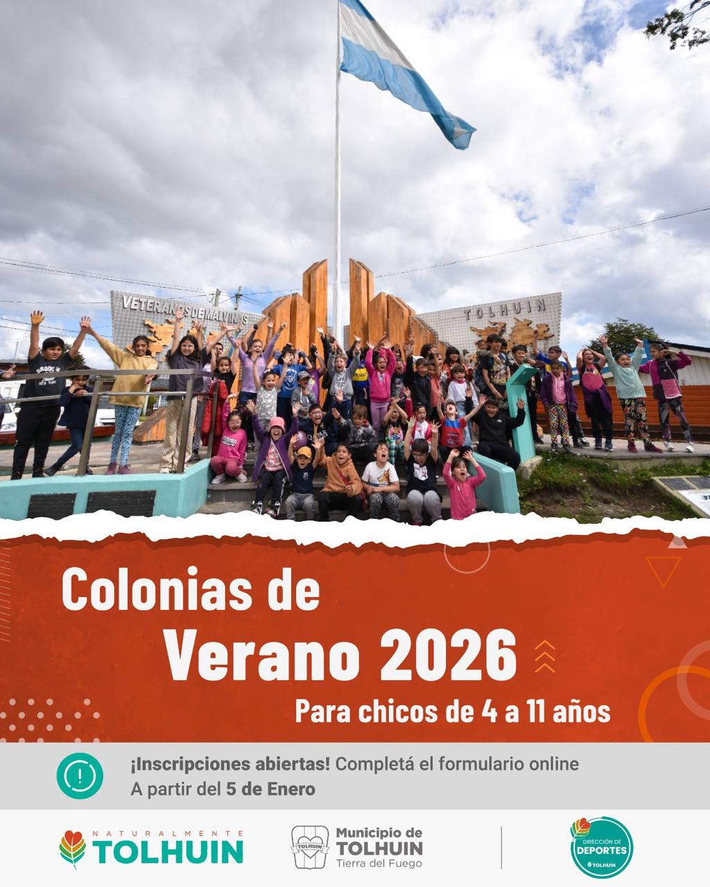 El Municipio de Tolhuin, a través de la Dirección de Deportes, anunció la apertura de las inscripciones para las Colonias de Verano 2026, una propuesta destinada a niños y niñas de 4 a 11 años que podrán participar de juegos, actividades recreativas, deportes y diversas iniciativas pensadas para disfrutar la temporada estival.