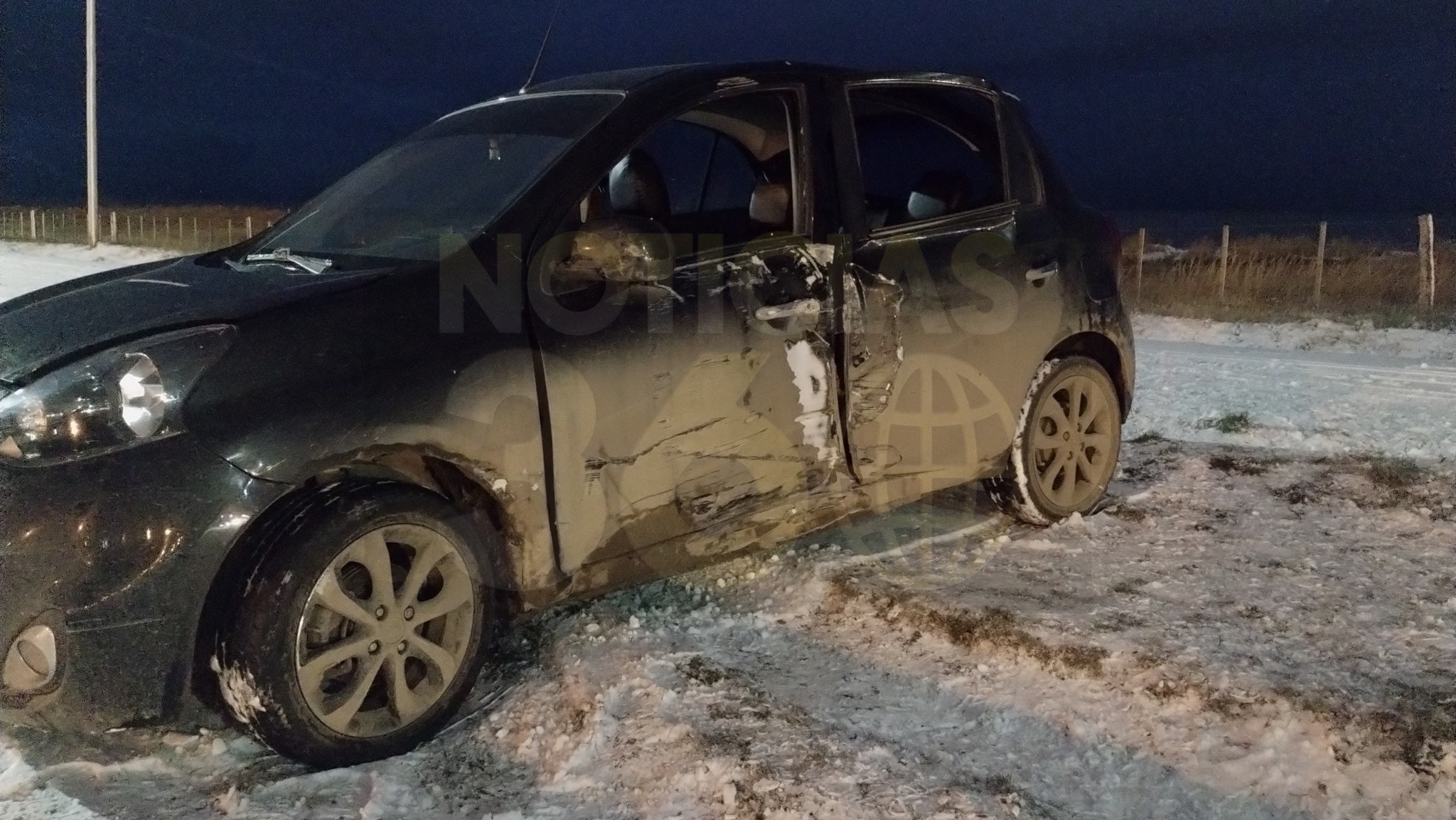 La conductora del rodado, que se trasladaba junto a tres menores de edad, perdió el control del vehículo, el cual patinó sobre el pavimento congelado y terminó impactando de lleno con el lateral izquierdo contra una columna de alumbrado público. El golpe provocó importantes daños materiales, especialmente del lado del conductor.