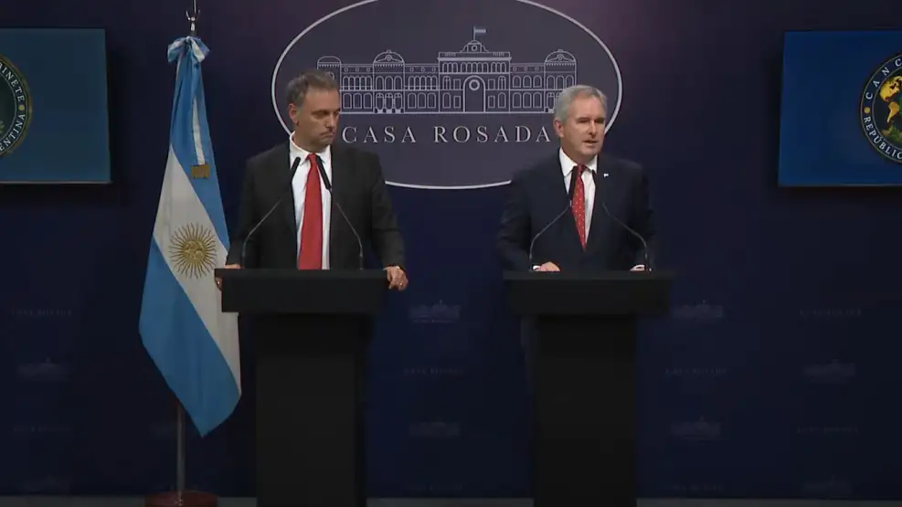 El jefe de Gabinete, Manuel Adorni, y el canciller Pablo Quirno brindaron este jueves una conferencia de prensa en la Casa Rosada para comunicar los detalles del Acuerdo de Comercio e Inversión Recíproco con Estados Unidos, firmado en Washington. El documento será enviado al Congreso para su tratamiento parlamentario.