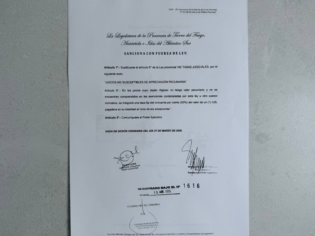 Con la firma del Gobernador Gustavo Melella, mediante el decreto Nº 0649/26 fue promulgada el 15 de abril la Ley Nº 1616/26 que modifica la ley Nº 162 de Tasas Judiciales.