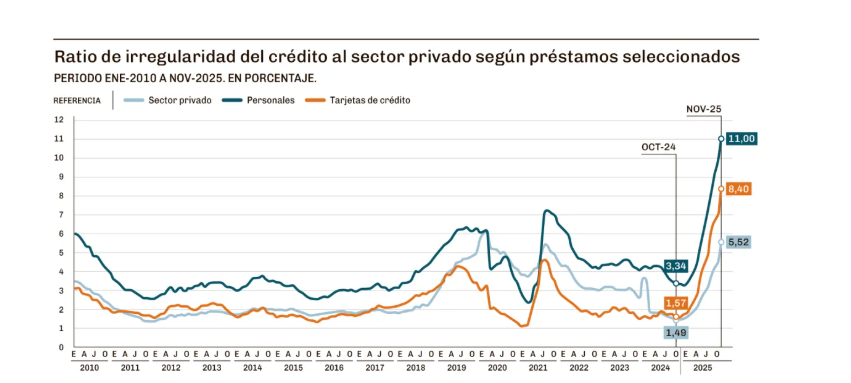 Del mismo informe surge que la morosidad en el pago de tarjetas de crédito llegó a fines del 2025 al 8,40%, mientras que la mora en el pago de préstamos personales se elevó hasta el 11%. En ambos casos se trata de los valores más altos de morosidad en una década y media.
