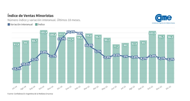 Por su parte, la Cámara Argentina de la Mediana Empresa (CAME), publica mensualmente un relevamiento de ventas minoristas medidas por cantidad a nivel nacional. Ese registro arrojó una caída interanual del 5,2% en el pasado mes de diciembre, y acumula ocho meses consecutivos de baja interanual desde mayo. El signo es distintivo: se vende menos, es decir, se consume menos.