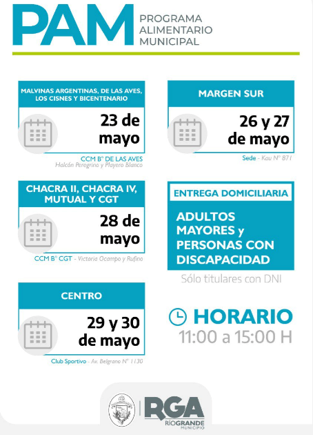 El Municipio de Río Grande informa a la comunidad que este viernes 23 de mayo comenzará la distribución de los módulos alimentarios a las vecinas y vecinos de diferentes puntos de la ciudad que están empadronados en el Programa.