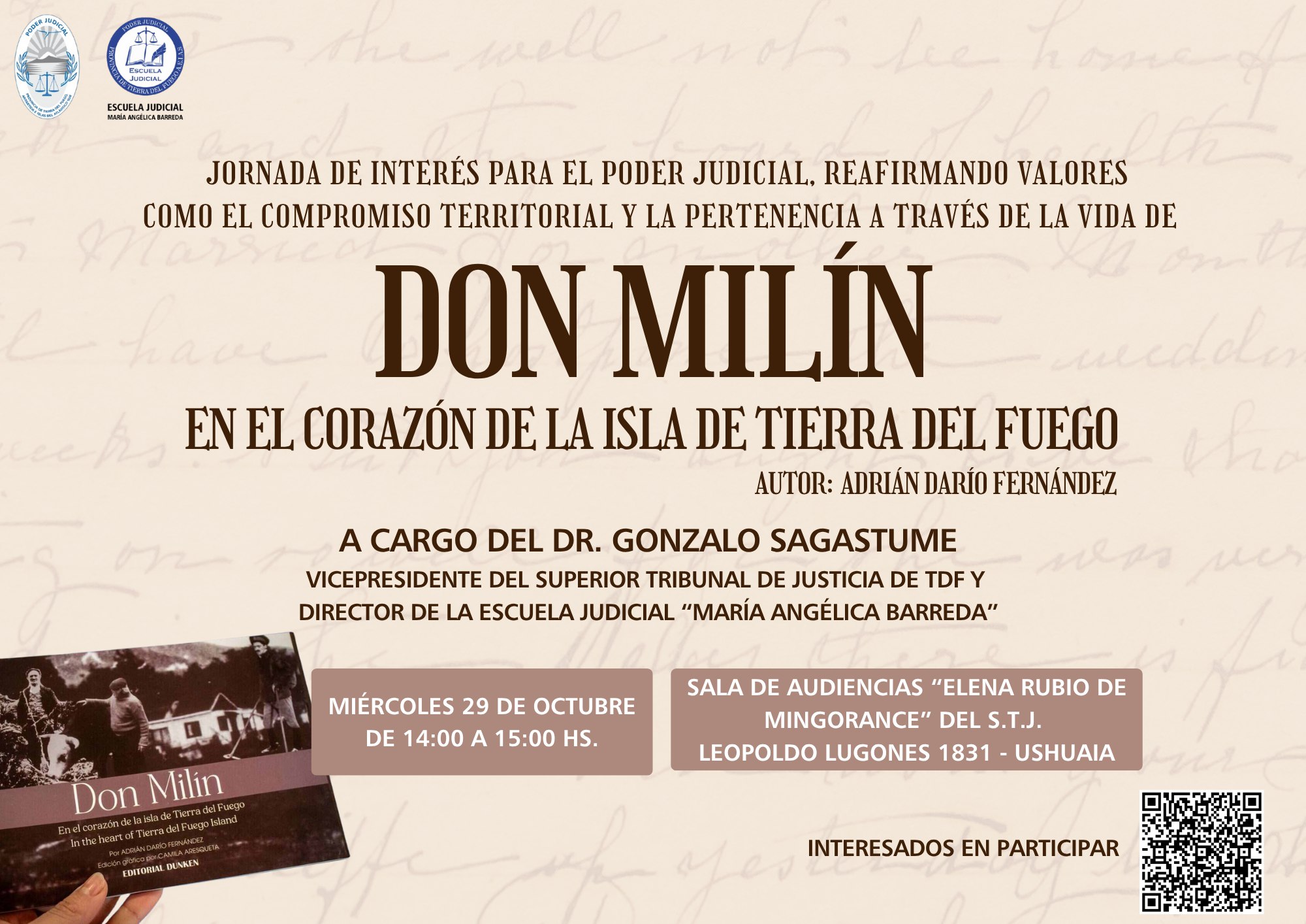El Poder Judicial, a través de la Escuela Judicial invita a la comunidad a participar de la jornada de interés para el Poder Judicial, en el que se abordará la reafirmación de valores, como el compromiso territorial y la pertenencia, a través de la vida de “Don Milín” en el Corazón de la Isla de Tierra del Fuego. Está basada en el libro homónimo, cuya autoría corresponde a Adrián Darío Fernández.