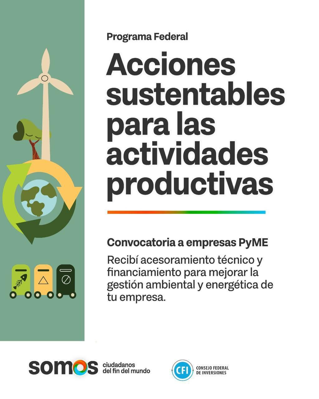 La Secretaría de Ambiente en conjunto con el Consejo Federal de Inversiones (CFI), informa que sigue abierta la convocatoria al Programa Federal “Acciones Sustentables en Actividades Productivas”, orientado a Micro, Pequeñas y Medianas Empresas (MiPyMEs) fueguinas.