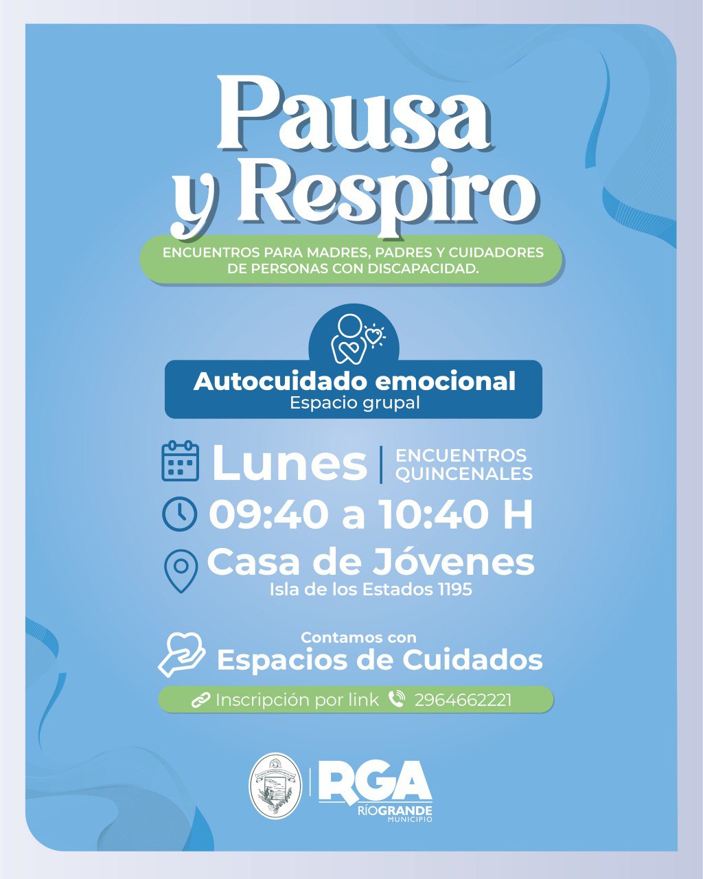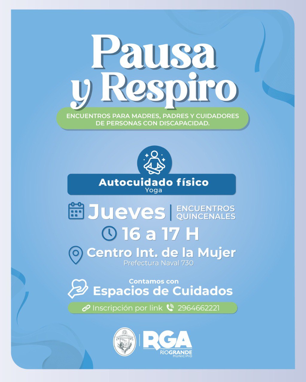 “Pausa y Respiro” cuenta con diferentes actividades: “Autocuidado emocional”, el cual es un espacio grupal para familias cuidadoras, a cargo de las Lic. Jorgelina Esandi y Barbara Tokar. La misma se desarrolla los lunes de manera quincenal, de 9.40 a 10.40 horas, en Casa de Jóvenes (Isla de los Estados 1195). Además, cuenta con “Autocuidado físico” que incluye sesiones de yoga, a cargo de la Prof. Lorena Antonio. Las mismas se realizan los jueves de manera quincenal, de 16 a 17 horas, en el Centro Integral de la Mujer (Prefectura Naval 730).