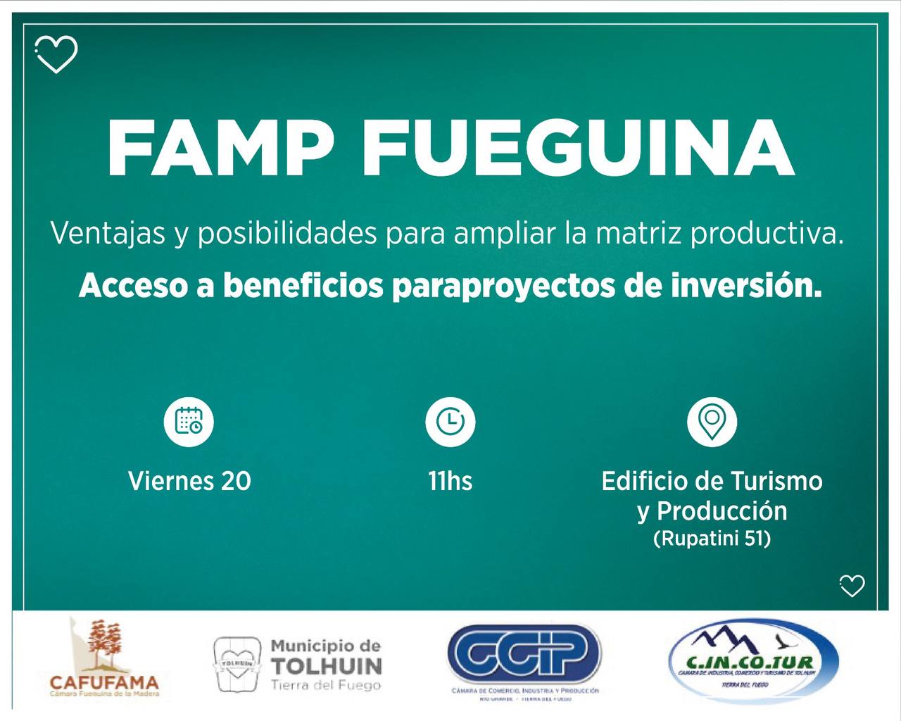 El próximo viernes 20 de diciembre a las 11:00 hs se llevará a cabo una reunión en la Secretaría de Turismo y Producción de Tolhuin, ubicada en Santiago Rupatini 51. El encuentro estará enfocado en los beneficios y oportunidades del Fondo de Ampliación de la Matriz Productiva Fueguina (FAMP).