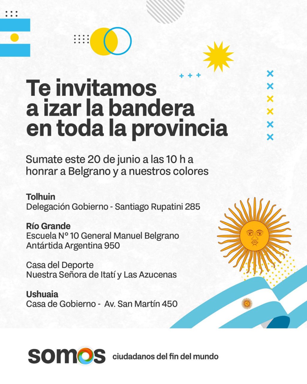 Desde el Gobierno de la Provincia se invita a todos los fueguinos a que se acerquen con su bandera nacional o acompañar esta emotiva ceremonia, entendiendo que la bandera argentina es el símbolo patrio más antiguo que tenemos y fue izada por primera vez en 1812 a orillas del Río Paraná durante la gesta por la independencia de las Provincias Unidas del Río de la Plata.