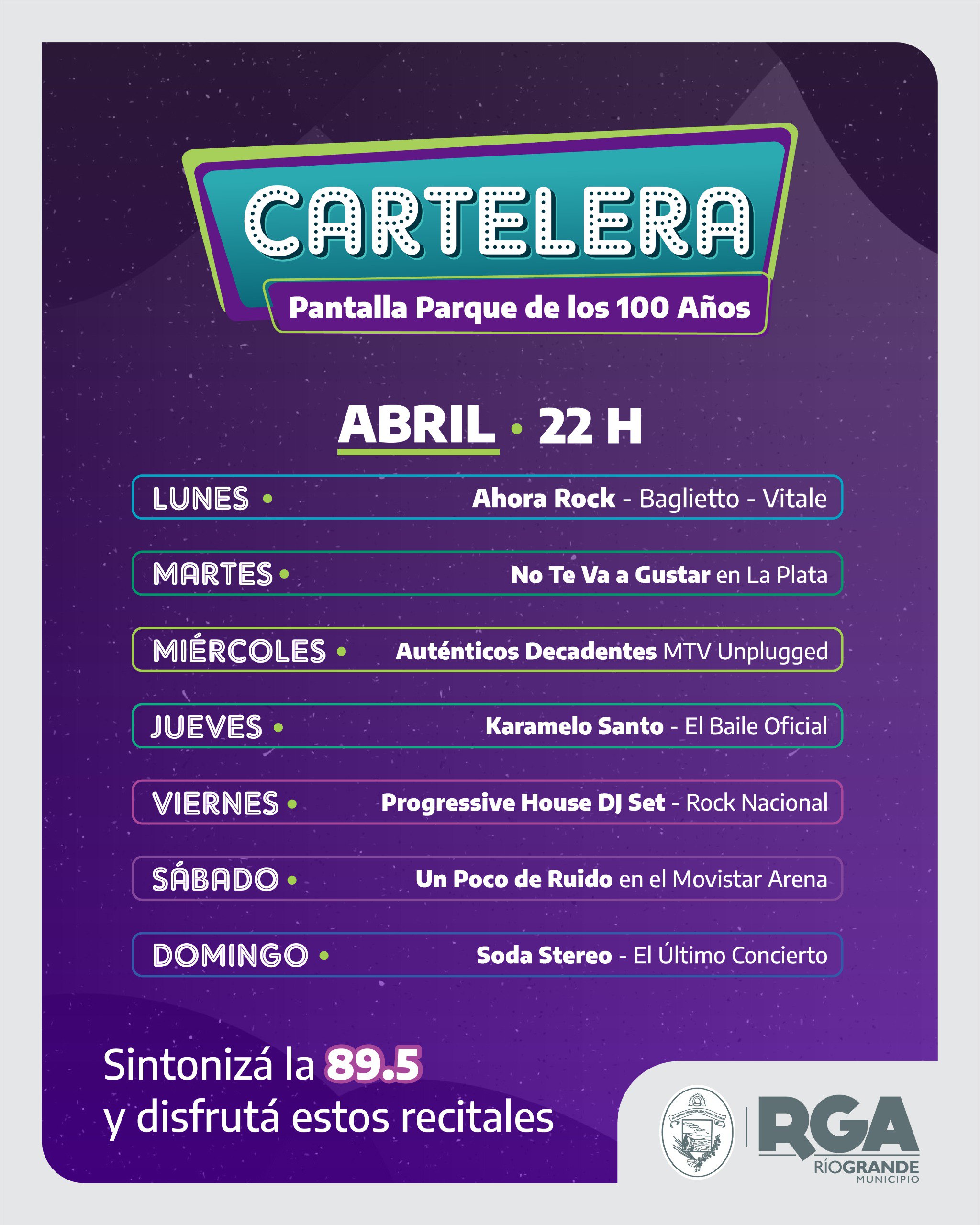 Durante abril, se transmitirán diferentes recitales en la pantalla grande del Parque en pos de que las y los riograndenses disfruten de este punto de encuentro. Quienes vayan con sus vehículos podrán escuchar, a partir de las 22 horas, vía estéreo mediante el dial 89.5.