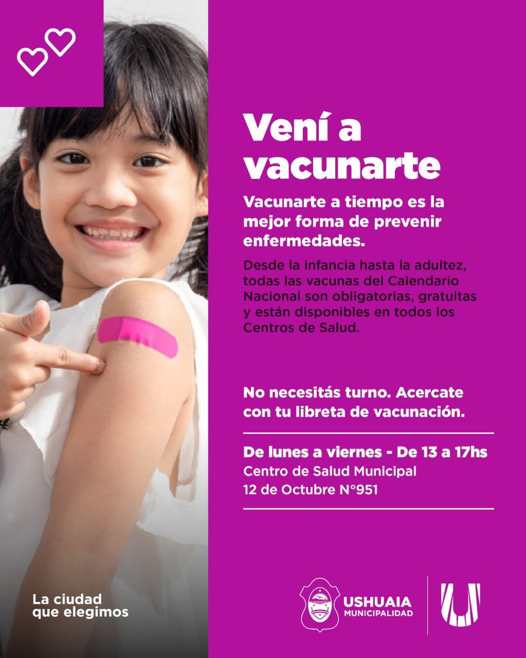 La Secretaría de Políticas Sociales, Sanitarias y Derechos Humanos recuerda la importancia de mantener completo el esquema de vacunación. Desde el Centro de Salud Municipal de Ushuaia se refuerza la importancia de la vacunación en todas las etapas de la vida.