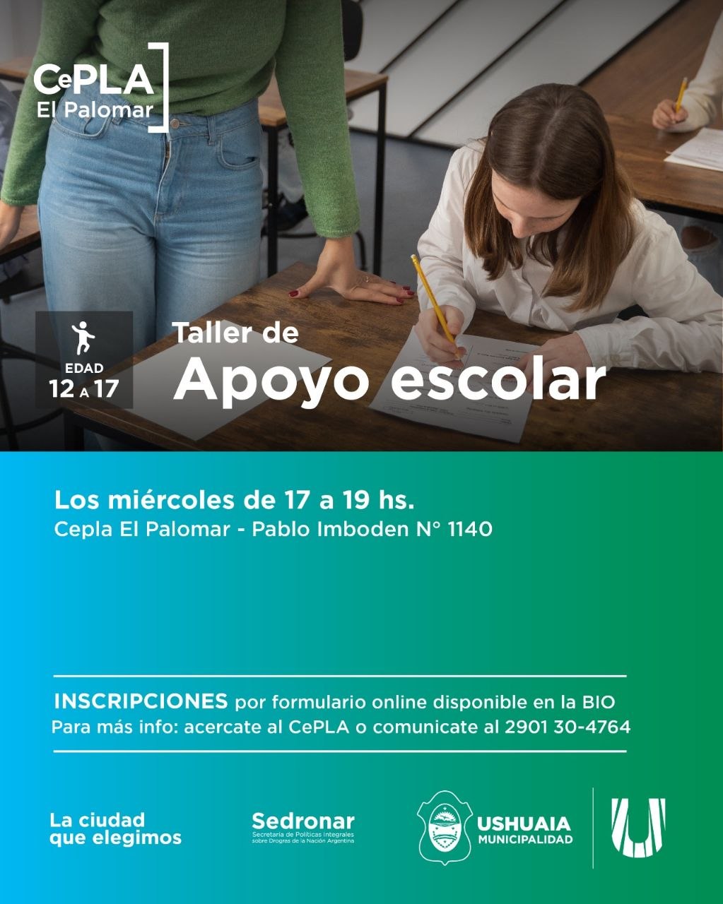a Municipalidad de Ushuaia, a través del CePLA El Palomar, dependiente de la Secretaría de la Mujer y Desarrollo Humano, informa que se encuentran abiertas las inscripciones para el taller de apoyo escolar, destinado a adolescentes de entre 12 y 17 años que cursan el nivel secundario.
