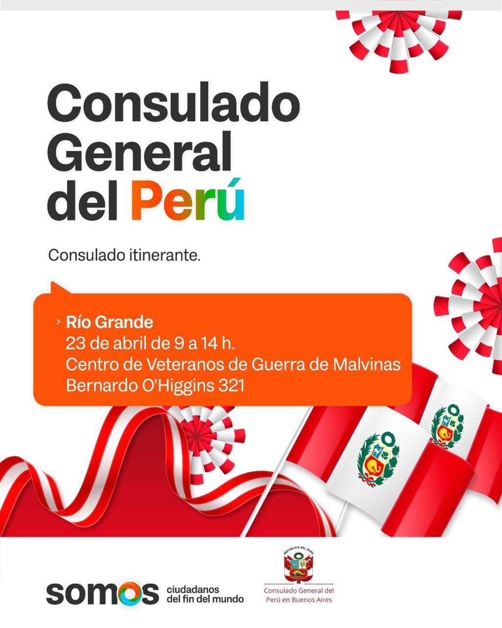 El próximo miércoles 23 de abril, la ciudad de Río Grande será sede de un Consulado Itinerante del Perú, destinado a brindar servicios consulares a los ciudadanos peruanos residentes en la región. La jornada se llevará a cabo en el Centro de Veteranos de Guerra de Malvinas, ubicado en O’Higgins 321, de 9 a 14 h.