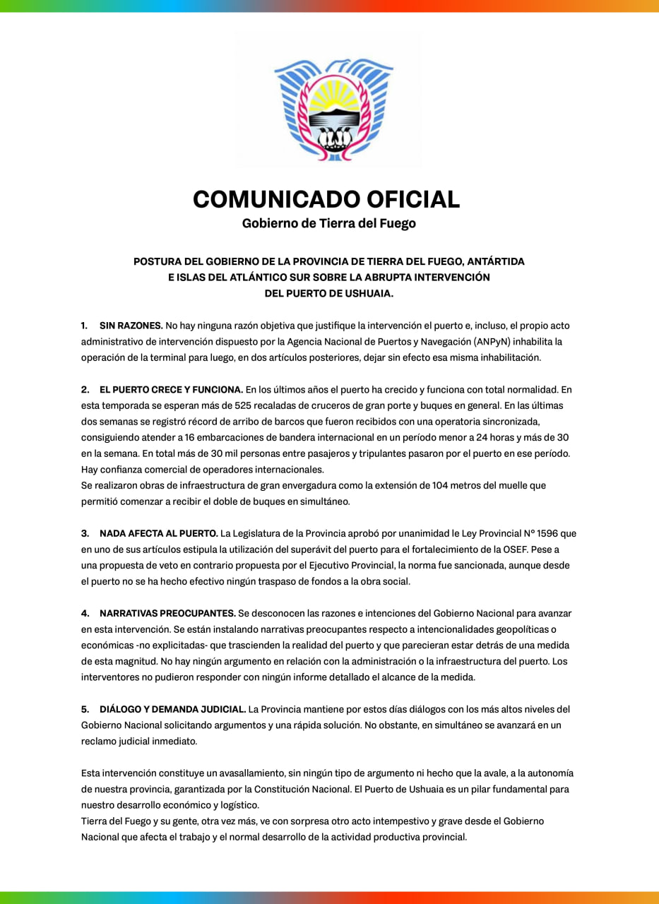 El Gobierno de Tierra del Fuego AIAS emitió un comunicado oficial sentando postura institucional sobre la intervención del Puerto de Ushuaia ocurrida este miércoles 21 de enero. El documento desarrolla cinco puntos en los que considera los aspectos centrales de la intervención y la falta de justificación para una medida de esa magnitud.