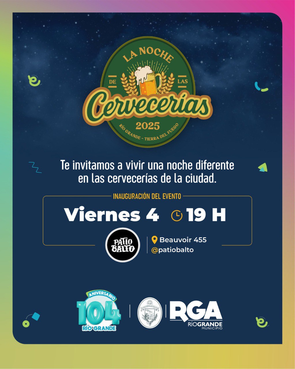 En el marco del 104º aniversario de la ciudad, el Municipio de Río Grande, a través de la Subsecretaría de Turismo, llevará adelante una amplia agenda de actividades para la recreación y el disfrute de los vecinos y turistas. Los eventos comenzarán este 4 de julio con “La Noche de las Cervecerías”.