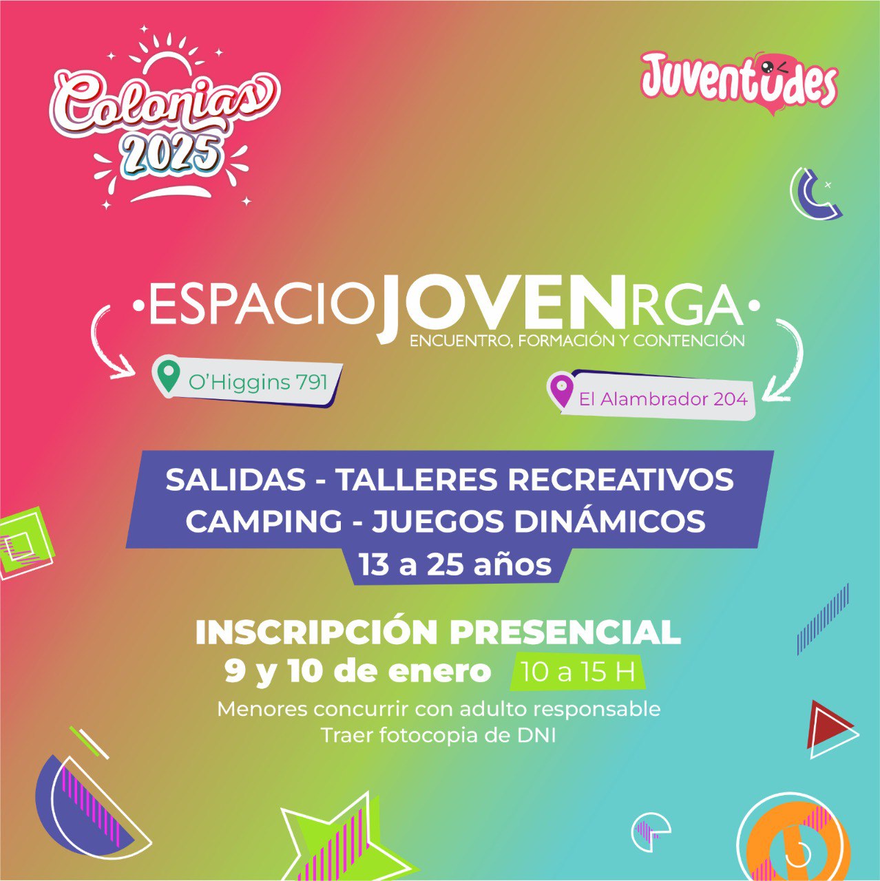 Este jueves 9 y viernes 10 de enero se llevarán a cabo las inscripciones para las colonias 2025 “Verano Joven RGA”. Las mismas serán de manera presencial en las instalaciones de Espacio Joven Zona Sur y AGP, ubicados en El Alambrador 204 y O’Higgins 791 respectivamente, de 10 a 15 horas.