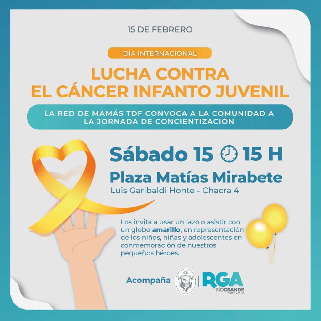 En ese marco, el Municipio de Río Grande también estará acompañando un evento organizado por «La Red de Mamás TDF», el cual se desarrollará este sábado 15 de febrero, a las 15 horas, en la plaza Matías Mirabete ubicada en Chacra IV (calle Luis Garibaldi Honte). Quienes asistan pueden asistir con un lazo o globo color amarillo en representación de las infancias y adolescentes que están en tratamiento y en remisión, así como en conmemoración de quienes ya no están.
