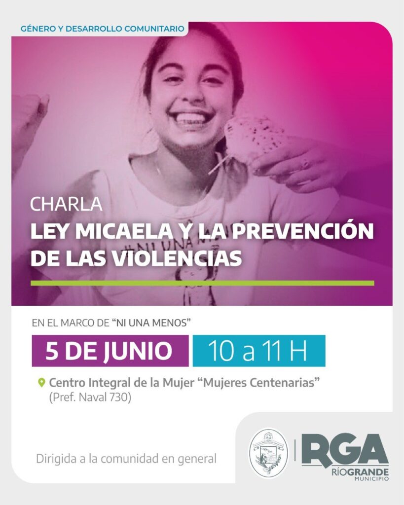 Finalmente, el jueves 5 de junio a las 10 horas, miembros de la Secretaría de Género y Desarrollo Comunitario, brindarán una charla enmarcada en la Ley Micaela, en la cual se tratará la prevención de las violencias. La misma, está destinada a todas las mujeres que son acompañadas por la secretaría y a la comunidad en general. Dicha charla se llevará a cabo en el Centro Integral de la Mujer “Mujeres Centenarias” ubicado en Prefectura Naval 730.