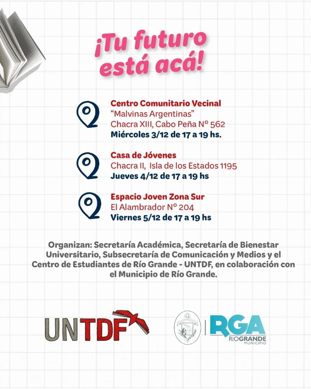 La iniciativa se desarrollará a lo largo de tres jornadas. El miércoles 3 de diciembre, la atención será en el Centro Comunitario Municipal Malvinas Argentinas, ubicado en Cabo Peña N.º 562 de Chacra XIII. El jueves 4, la propuesta continuará en Casa de Jóvenes, en Isla de los Estados N.° 1195 de Chacra II. Finalmente, el viernes 5 de diciembre la actividad llegará al Espacio Joven Zona Sur, en El Alambrador N.º 204. En todos los casos, el horario de atención será de 17 a 19 horas.