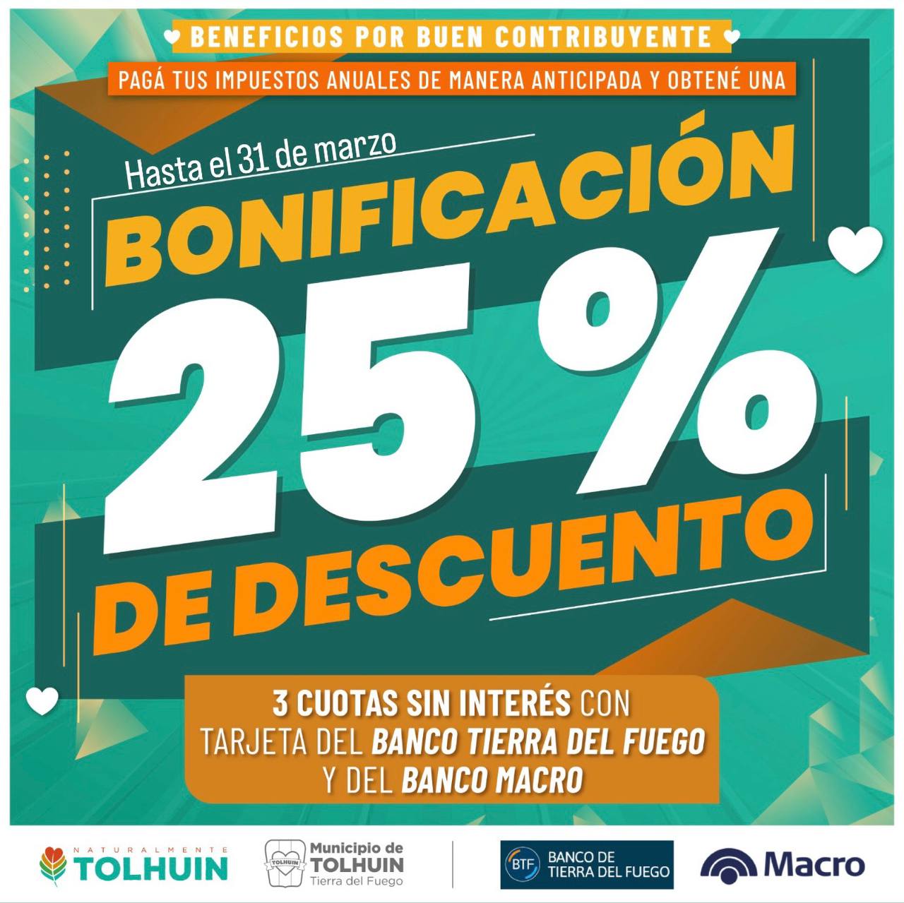El Municipio de Tolhuin anunció una nueva campaña destinada a promover el pago anual anticipado de impuestos municipales, que estará vigente hasta el 31 de marzo.
