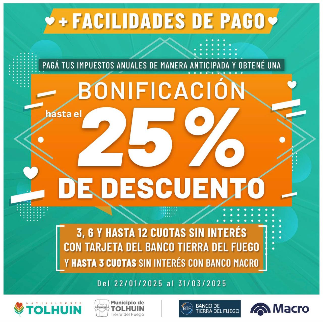Con el objetivo de facilitar el cumplimiento de las obligaciones tributarias y mejorar los servicios municipales, el Municipio de Tolhuin anunció una nueva campaña que incluye bonificaciones de hasta el 25% en el pago anual de impuestos municipales y opciones de financiamiento en cuotas sin interés.