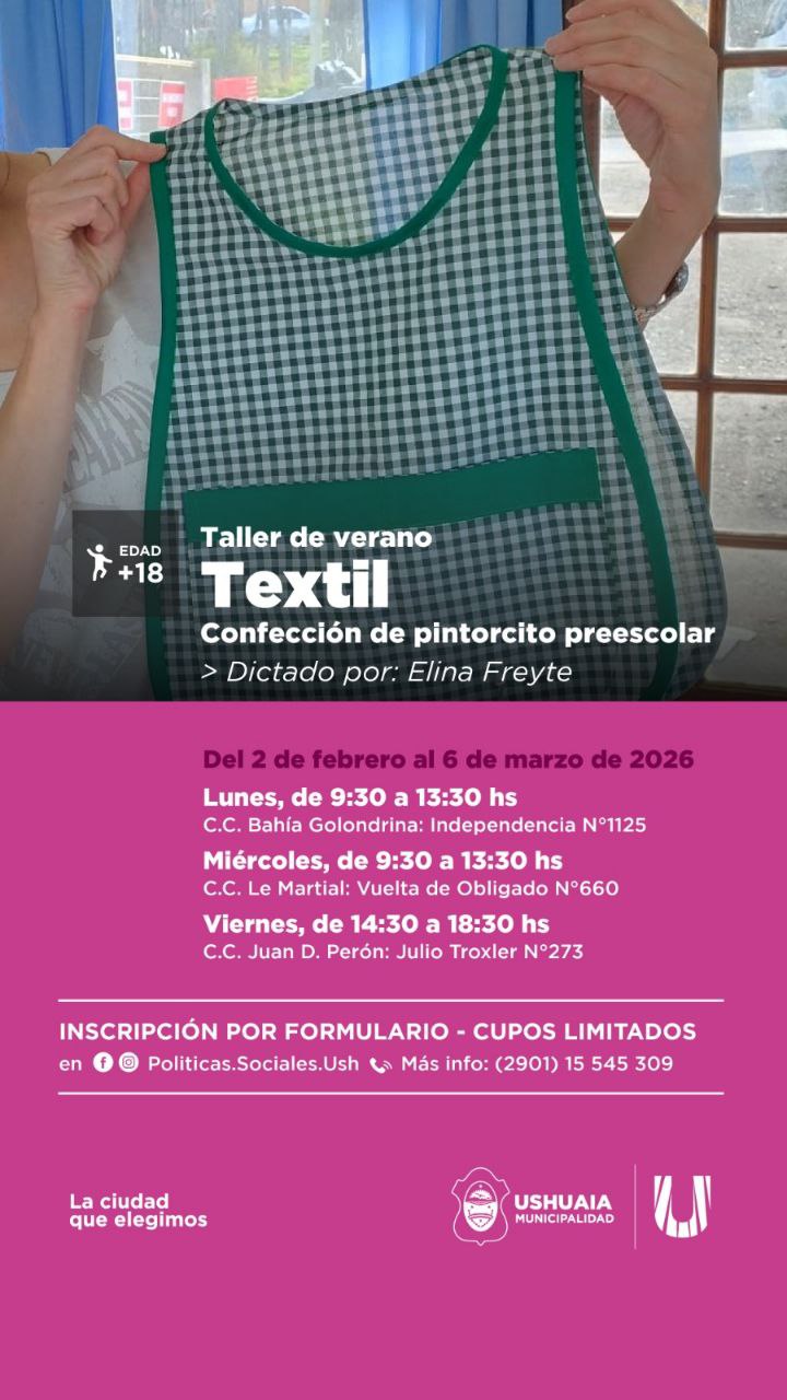 La Secretaría de Políticas Sociales, Sanitarias y Derechos Humanos de la Municipalidad de Ushuaia informa que se encuentra abierta la inscripción para el Taller de Verano Textil: Confección de Pintorcito Preescolar, una propuesta formativa destinada a personas mayores de 18 años.