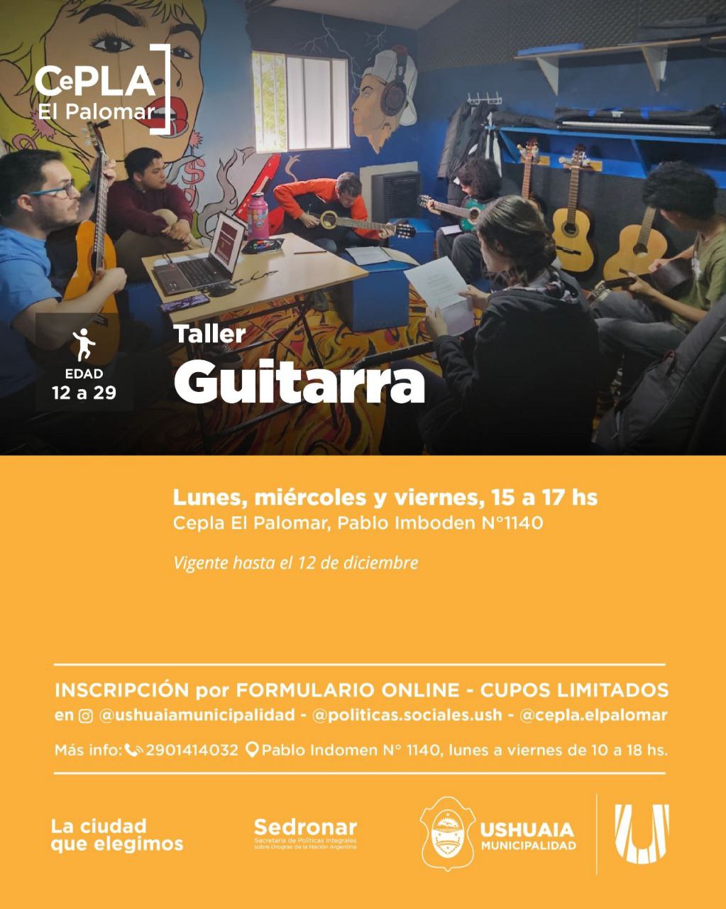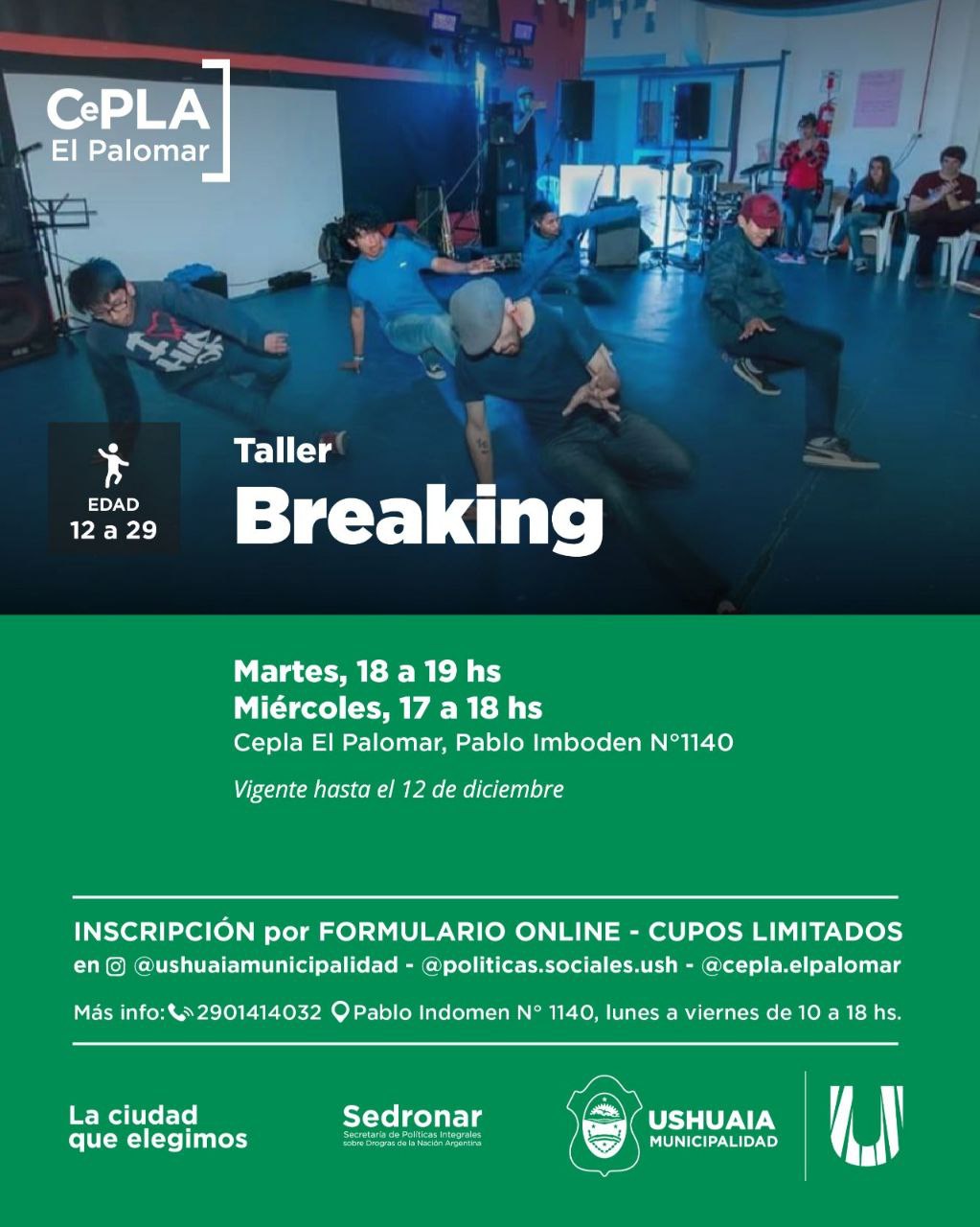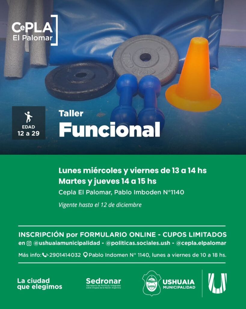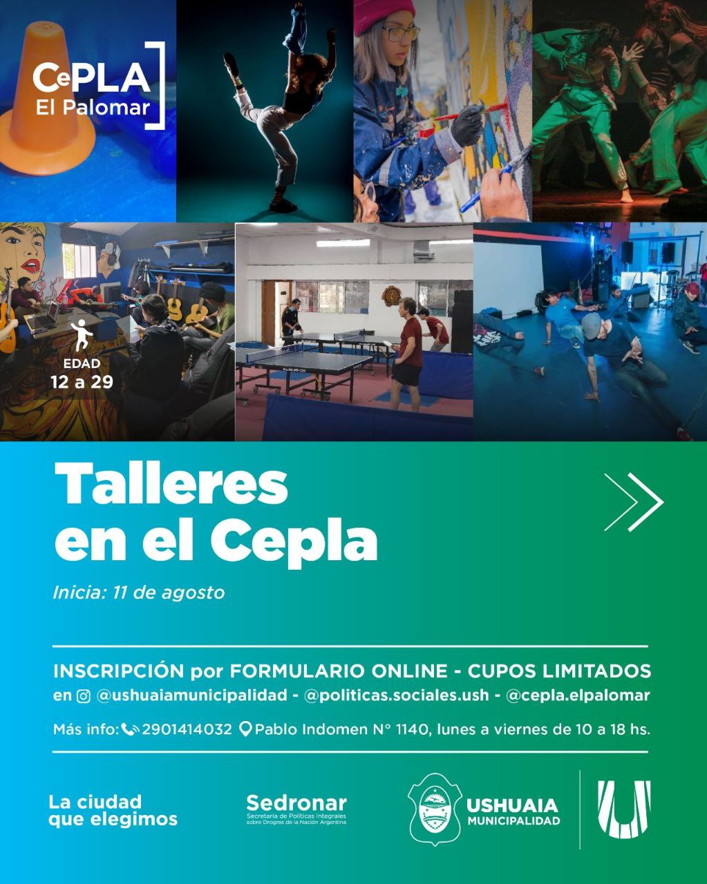 La Municipalidad de Ushuaia, a través de la Secretaría de Políticas Sociales, Sanitarias y Derechos Humanos, invita a adolescentes y jóvenes de 12 a 29 años a participar de los talleres gratuitos que se desarrollan en el CePLA–El Palomar, ubicado en Pablo Imboden 1140 del barrio 245 Viviendas.