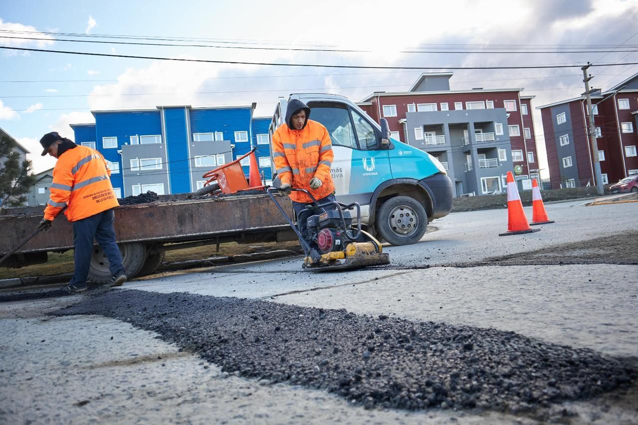 Personal de la Dirección de Bacheo de la Municipalidad de Ushuaia avanza con los trabajos de reparación de la red vial en diversos sectores de la ciudad, en función de un cronograma de tareas que tiene como eje las arterias de mayor tránsito para luego llegar a calles complementarias.