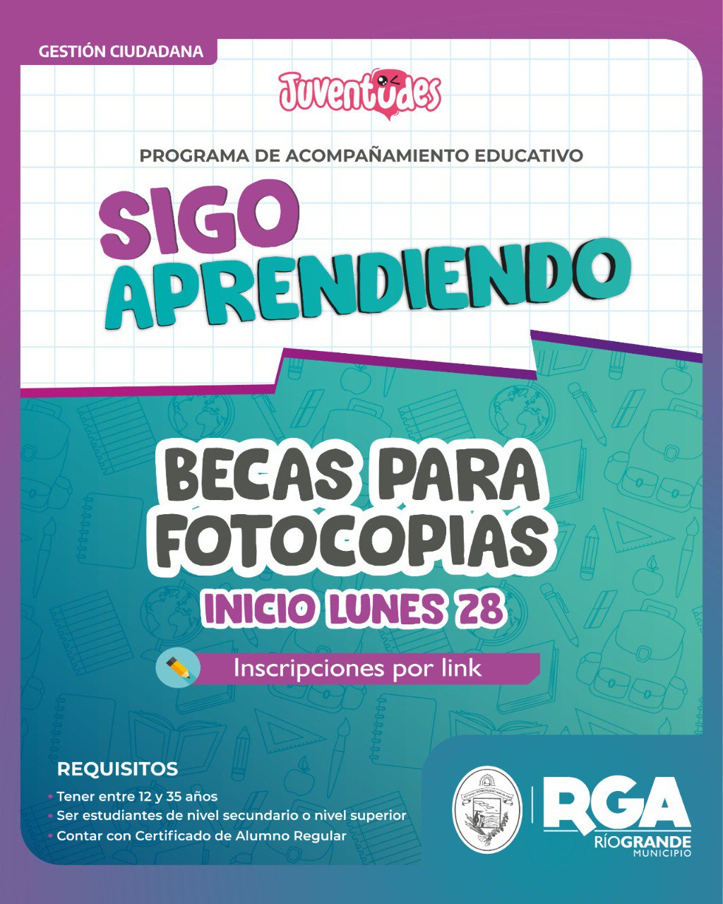 Desde el lunes 28 de julio estarán abiertas las inscripciones para Programa Municipal «Sigo Aprendiendo”, iniciativa que acompaña la trayectoria educativa de jóvenes riograndenses mediante la entrega de becas en fotocopias. Con esta propuesta, el Municipio continúa fortaleciendo el derecho a la educación a través de políticas públicas concretas.
