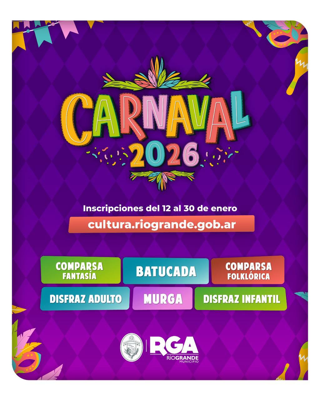 El Municipio de Río Grande invita a las agrupaciones de murgas, comparsas y batucadas de toda la provincia a sumarse y participar del Carnaval 2026 de la ciudad. Por ello, quienes estén interesados en ser parte deben hacerlo de manera online en el sitio web: https://cultura.riogrande.gob.ar/. Cabe mencionar que las inscripciones permanecerán abiertas hasta el 30 de enero