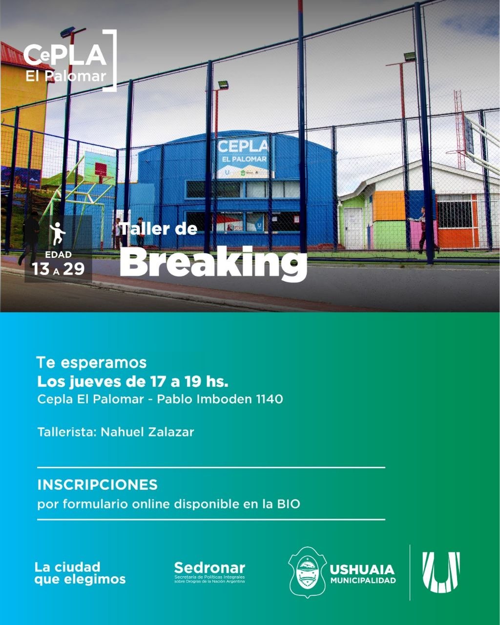 La Municipalidad de Ushuaia, a través de la Secretaría de la Mujer y Desarrollo Humano, invita a participar de un nuevo taller de breaking en el CePLA El Palomar.