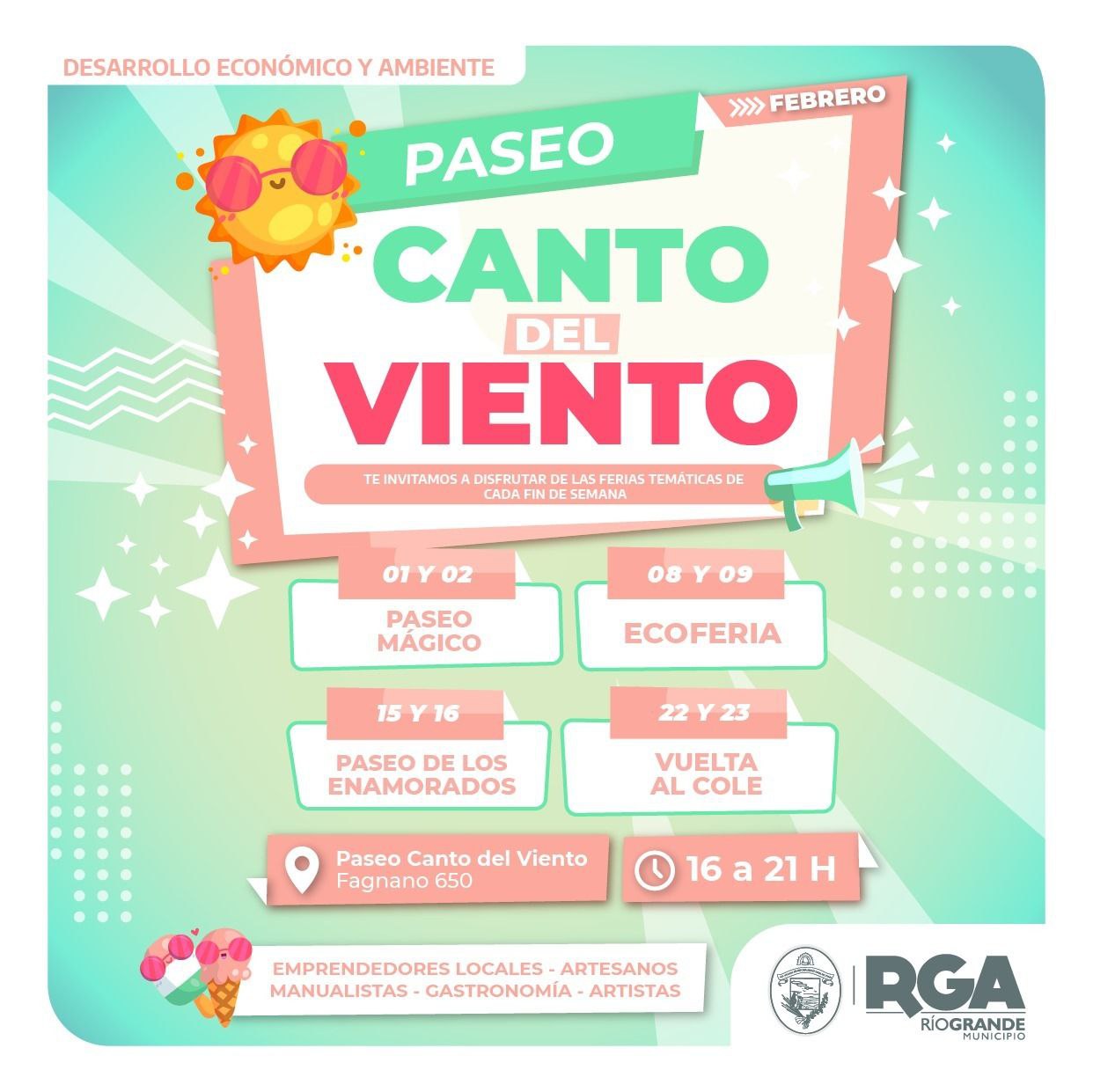 El Municipio de Río Grande presenta el cronograma de actividades de febrero, las cuales se desarrollarán en pos del disfrute y la recreación de los vecinos y vecinas en el Paseo Canto del Viento (Fagnano 650).