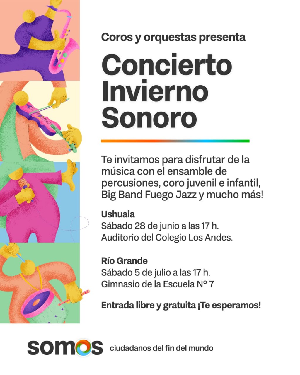 Primero el espectáculo se llevará a cabo en la ciudad de Ushuaia el sábado 28 de junio a las 17 horas en el Auditorio del Colegio «Los Andes» (F. Romero 205, B° 640 viviendas), donde participarán los proyectos de Coro Infantil y Ensamble de Cuerdas de Ushuaia y el Ensamble de Percusión «Latido Austral», de Tolhuin.