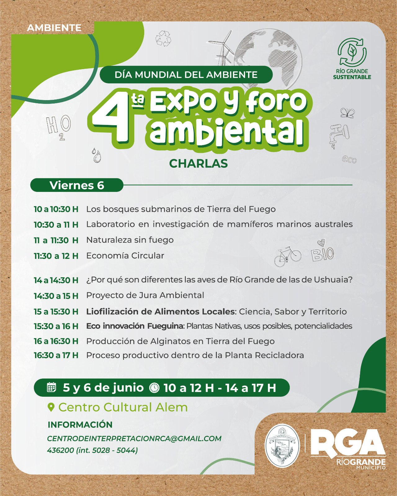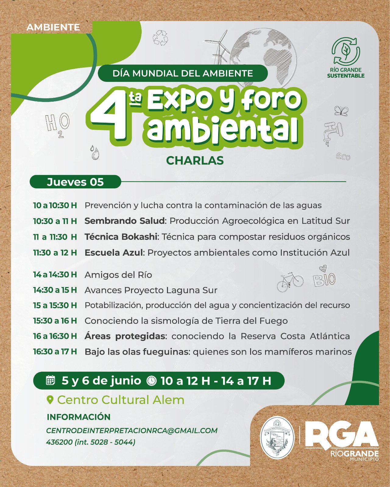 En el marco de la 52° conmemoración por el Día Mundial del Ambiente, el Municipio de Río Grande llevará adelante por cuarto año consecutivo la Expo y el Foro Ambiental de nuestra ciudad. La actividad se realizará el jueves 5 y viernes 6 de junio, de 10 a 17 horas, en el Centro Cultural Alem.
