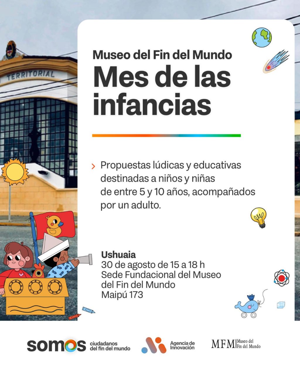 En el marco del Mes de las Infancias, el Museo del Fin del Mundo abre sus puertas el próximo sábado 30 de agosto con propuestas lúdicas y educativas destinadas especialmente a los niños y niñas de entre 5 y 10 años que deberán asistir acompañados de un adulto.