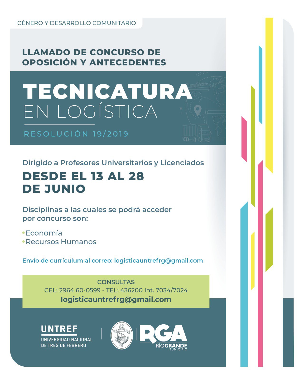 El plazo de inscripción será desde el 13 hasta el 28 de junio. Quienes requieran más información y para el envío de currículum se deben comunicar por correo electrónico logisticauntrefrg@gmail.com. También puede comunicarse al 2964-600599 o al 436200 Interno 7034/7024.