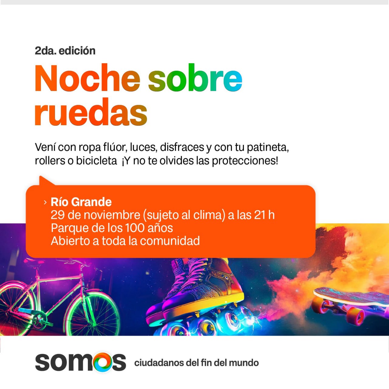 El Ministerio de Educación de la provincia de Tierra del Fuego, AeIAS invita a toda la comunidad de Río Grande a participar de la actividad recreativa “Noche sobre ruedas”, este viernes 29 de noviembre a las 21 horas en el Parque de los 100 Años.
