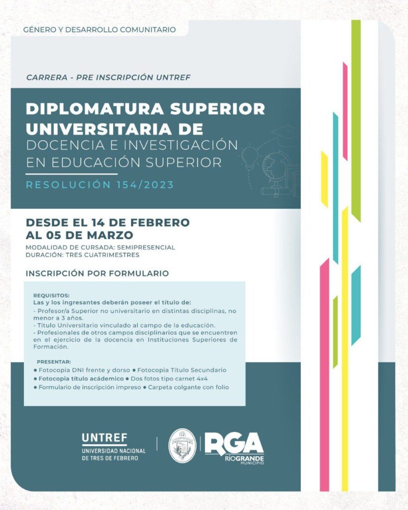 En el marco del convenio celebrado entre el Municipio de Río Grande y la Universidad Nacional de Tres de Febrero, se informa a la comunidad que ya se encuentran abiertas las preinscripciones para la Diplomatura Superior Universitaria de Docencia e Investigación en Educación Superior. Las mismas se extenderán hasta el 5 de marzo.