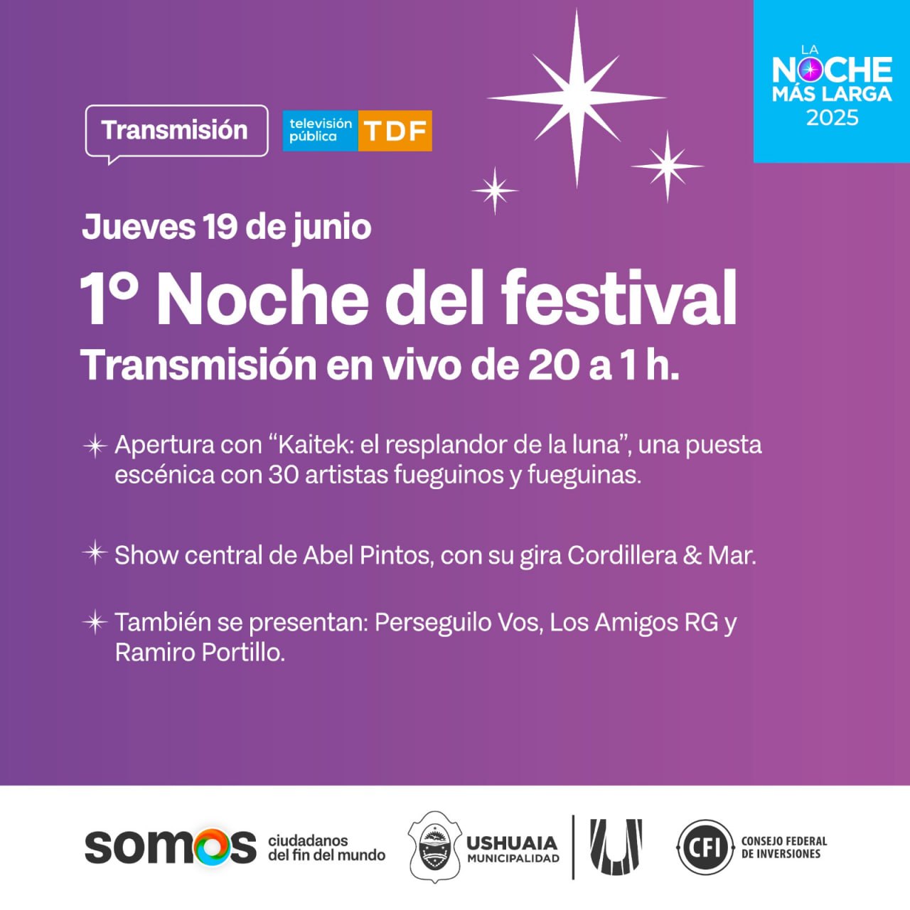 Este jueves 19 de junio, desde las 20 horas, comienza la edición 2025 de la Fiesta Nacional de la Noche Más Larga con transmisión en vivo por la Televisión Pública Fueguina.