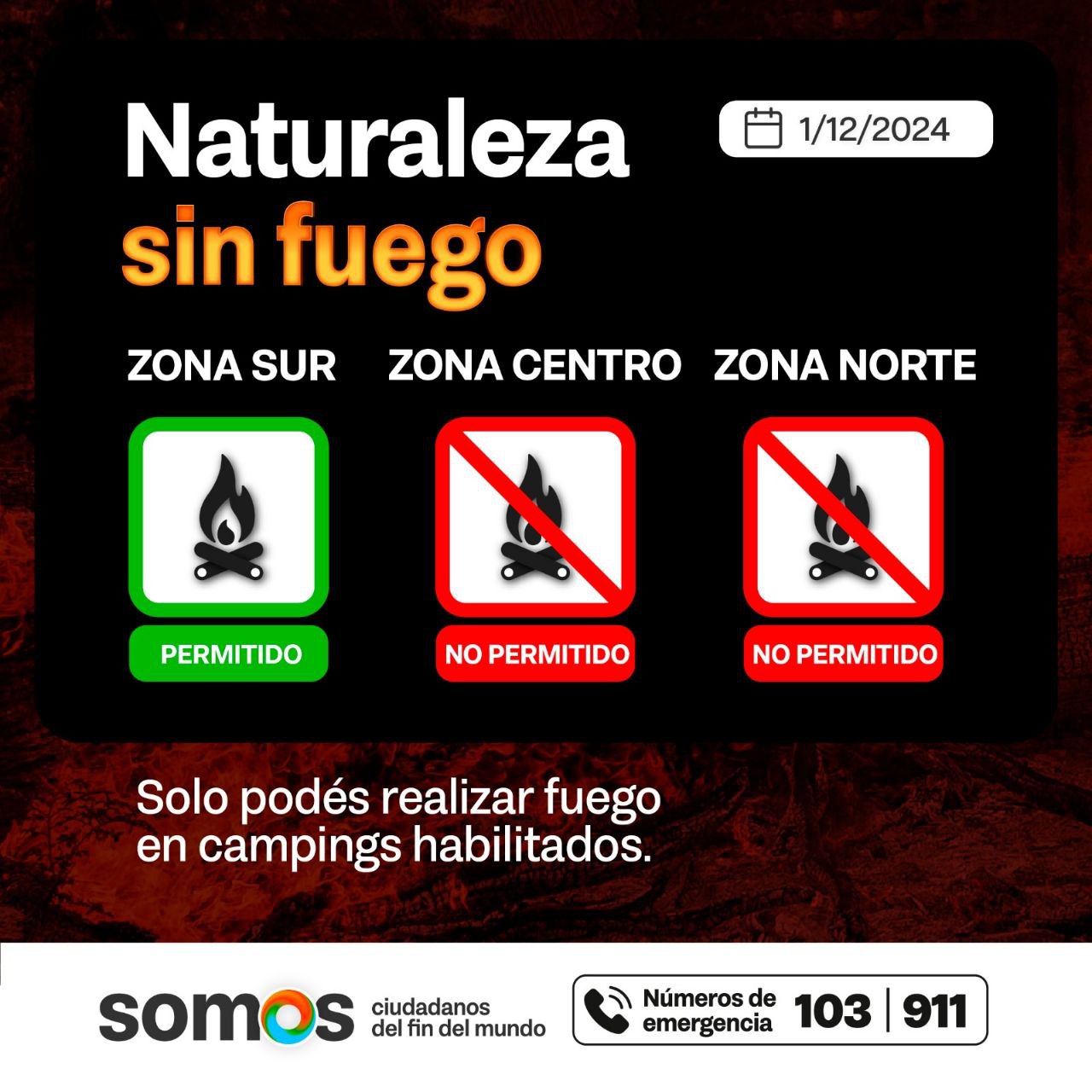 Para el día de hoy, en la ciudad de Río Grande y Tolhuin está prohibido hacer fuego, mientras que en Ushuaia únicamente se puede hacer fuego en sitios habilitados.
