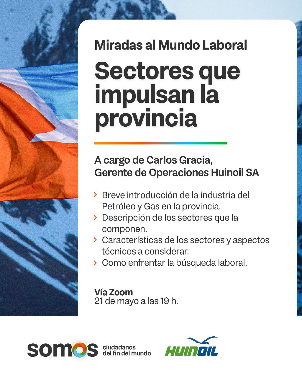La actividad inaugural del ciclo estará a cargo del Gerente de Operaciones de Huinol S.A, Carlos Gracia. La compañía es una de las firmas mayor trayectoria en servicios vinculados al desarrollo del sector hidrocarburífero en Tierra del Fuego. El encuentro se realizará el martes 21 de mayo a las 19:00 horas de manera virtual y con inscripción gratuita.