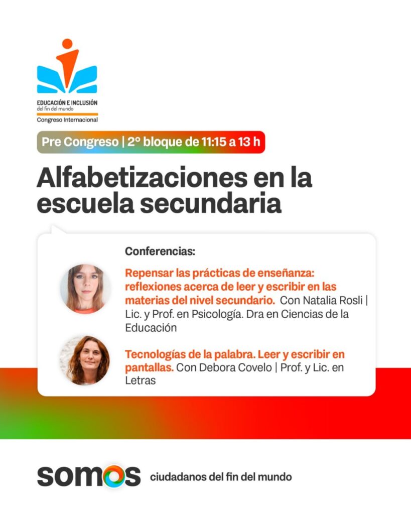 En el segundo bloque se desarrollará la temática “Alfabetizaciones en la escuela secundaria”. En este, Natalia Rosli, Licenciada y Profesora en Psicología y Dra. en Ciencias de la Educación, presentará la Conferencia “Repensar las prácticas de enseñanza: reflexiones acerca de leer y escribir en las materias del nivel secundario”. Por su lado, hará lo propio Debora Covelo, Profesora y Licenciada en Letras, quien se dedica a pensar las prácticas de lectura, escritura y oralidad en torno al auge de las tecnologías digitales, con la Conferencia «Tecnologías de la palabra. Leer y escribir en pantallas”.