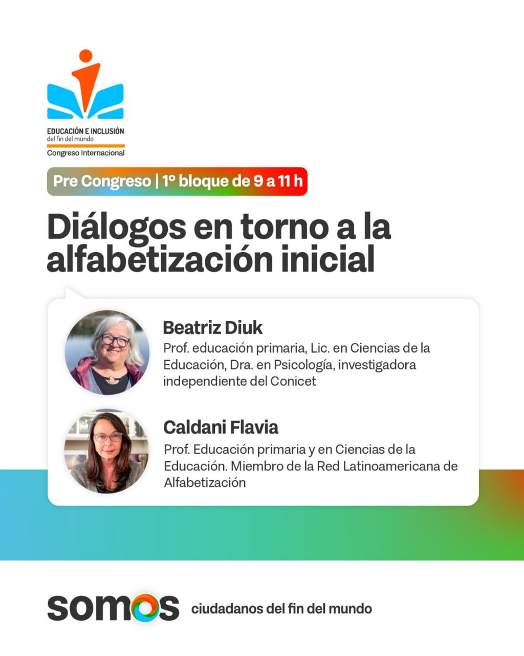 En el primer bloque se desarrollará la Conferencia “Diálogos en torno a la alfabetización inicial”, con la participación de Beatriz Diuk, Profesora de Educación Primaria, Licenciada en Ciencias de la Educación y Dra. en Psicología e investigadora independiente del Conicet, quien cuenta con una variedad de trabajos de investigación centrados en los procesos de adquisición de la lectura y la escritura, con atención especial al desarrollo de estos procesos en chicos y chicas que crecen en contextos de pobreza y Caldani Flavia, Profesora de Educación primaria y en Ciencias de la Educación. Miembro de la Red Latinoamericana de Alfabetización, con formación en la evaluación de aprendizajes y en la didáctica de la lectura, la escritura y la alfabetización inicial.