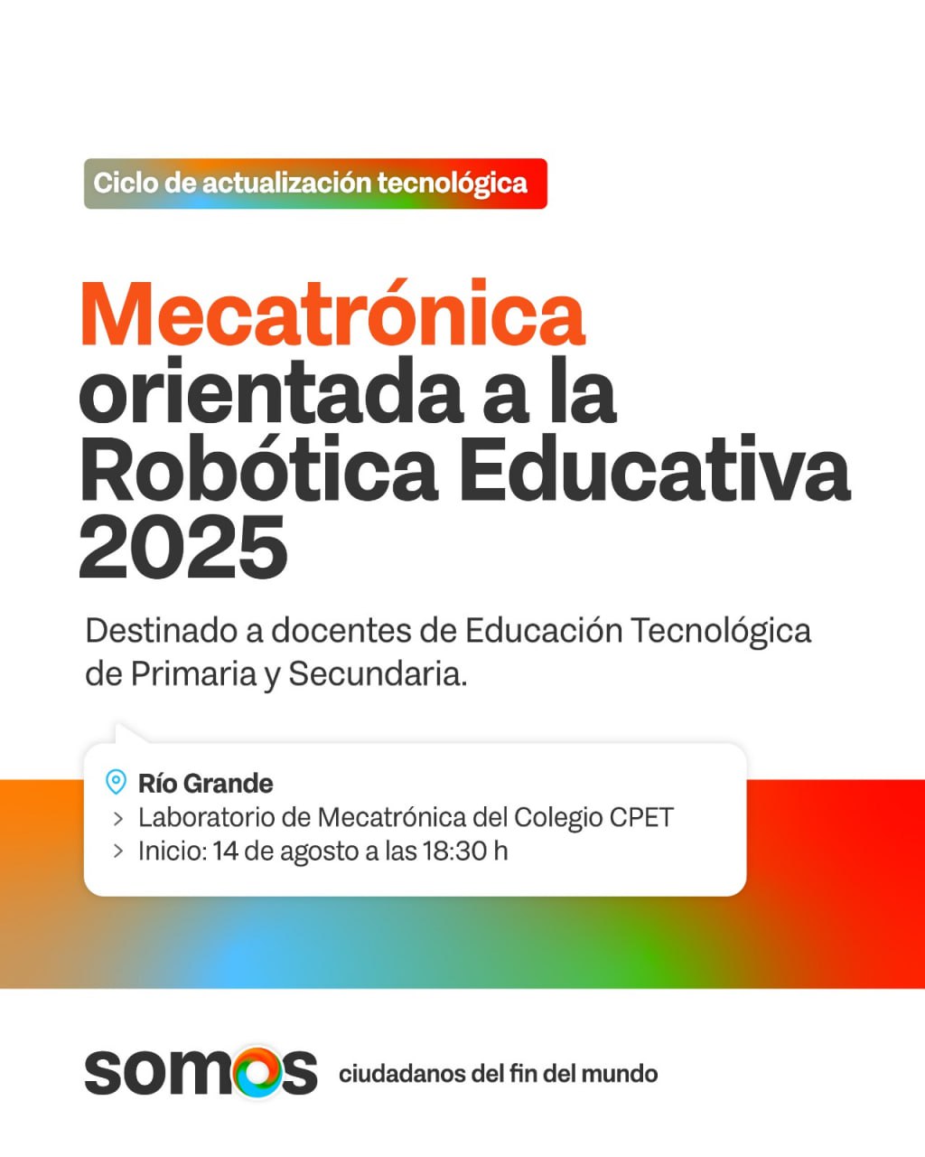 “Mecatrónica Orientada a la Robótica Educativa 2025” es una instancia de formación destinada a docentes de Educación Tecnológica y Matemática de primaria, secundaria y modalidades de la ciudad de Río Grande.