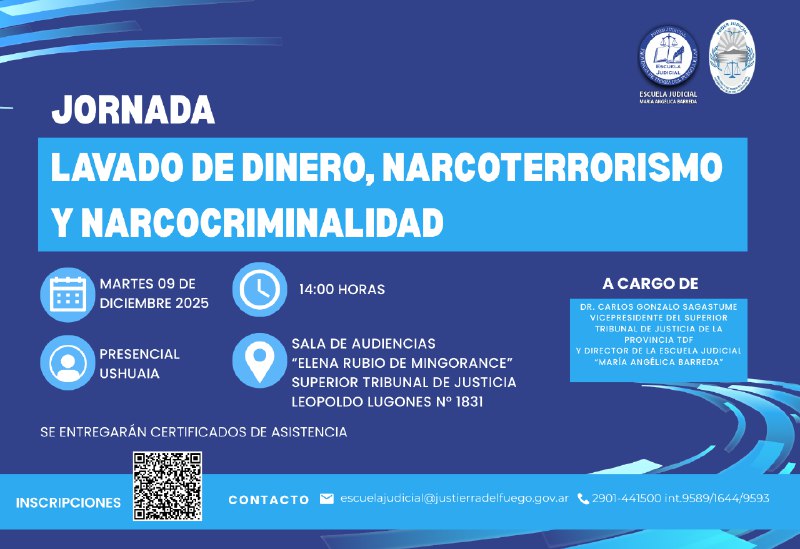 La Escuela Judicial “María Angélica Barreda” invita a la comunidad a participar de la Jornada académica denominada “Lavado de dinero, narcoterrorismo y narcocriminalidad”, que tendrá lugar el martes 9 de diciembre.