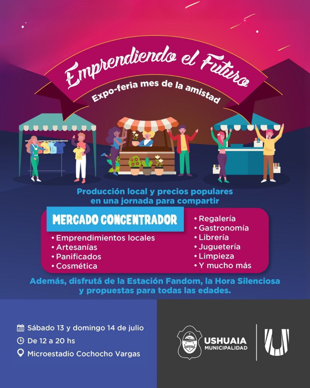 Entre el sábado 13 y domingo 14 de julio, de 12 a 20, se realizará una nueva edición del Expo Feria y Mercado Concentrador, organizada por la Municipalidad de Ushuaia en el marco del Mes de la Amistad. La propuesta tendrá lugar en el microestadio municipal José “Cochocho” Vargas y estará abierta a toda la comunidad.