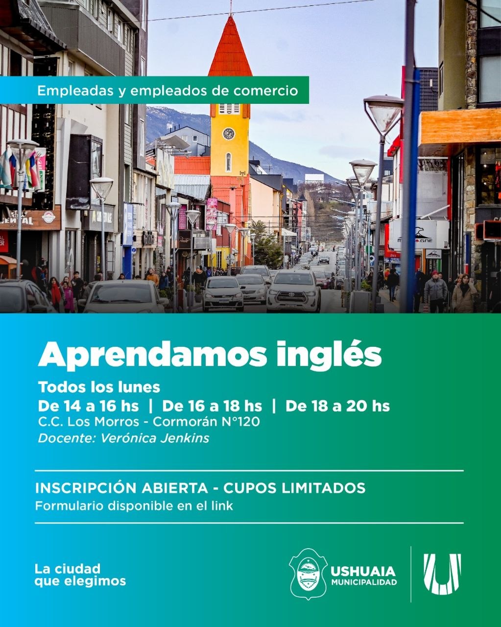 La Municipalidad de Ushuaia, a través de la Secretaría de la Mujer y Desarrollo Humano, informa que se encuentran abiertas las inscripciones para el taller “Aprendamos Inglés”, destinado a empleadas y empleados de comercio de la ciudad.