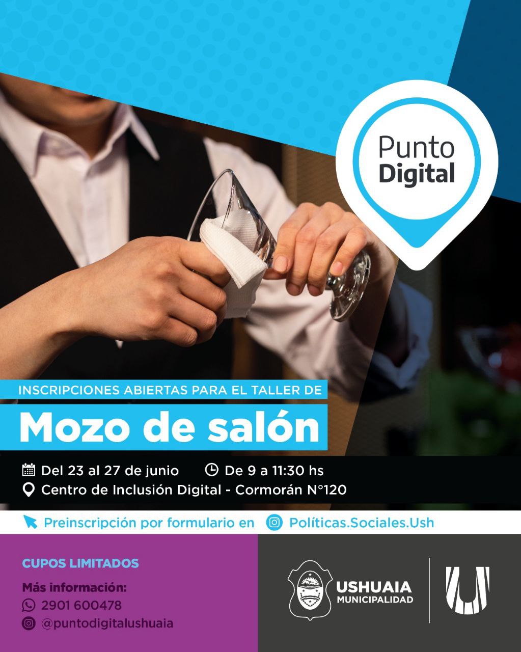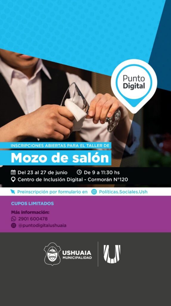 La Municipalidad de Ushuaia a través de la Secretaría de Políticas Sociales, Sanitarias y Derechos Humanos invita a los vecinos y vecinas a participar de una capacitación de “mozo de salón”, la cual tendrá lugar en Punto Digital, ubicado en Cormorán 120.