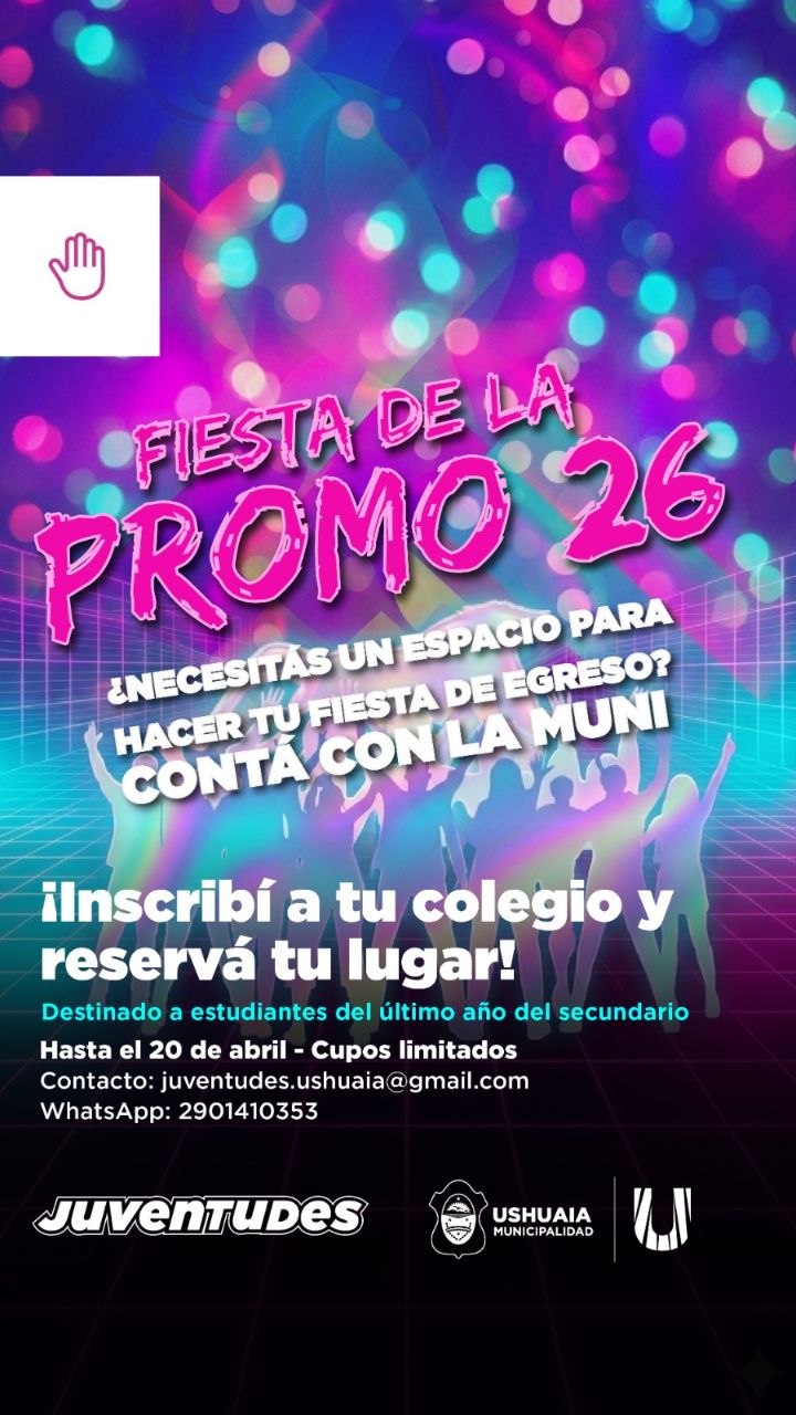 La Municipalidad de Ushuaia, a través de la Secretaría de la Mujer y Desarrollo Humano y la Secretaría de Políticas Ambientales, Culturales y Educativas, informa a la comunidad que se encuentra abierto el proceso de preinscripción para la “Fiesta de la Promo 26”.